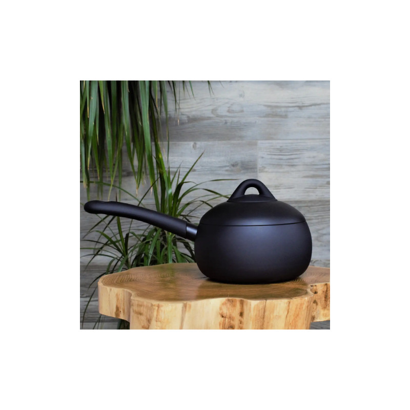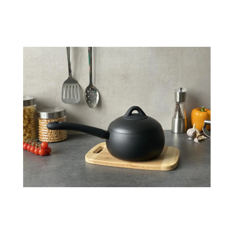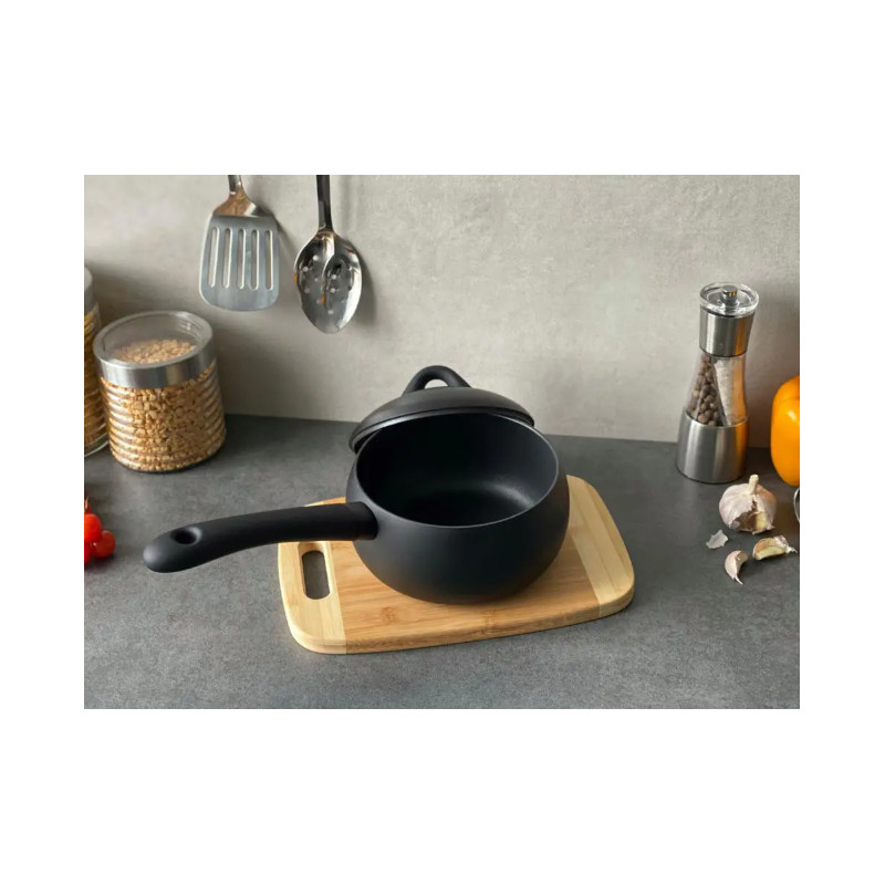 Має 3-шарове внутрішнє покриття Pfluon чорного кольору, яке забезпечує антипригарні властивості та стійкість до подряпин. Ручка виконана з бакеліту з силіконовими вставками та ефектом soft touch, що забезпечує зручне та безпечне захоплення каструлі під час приготування.