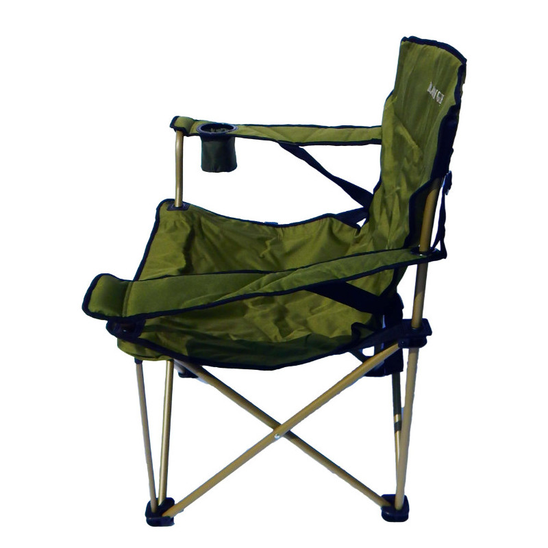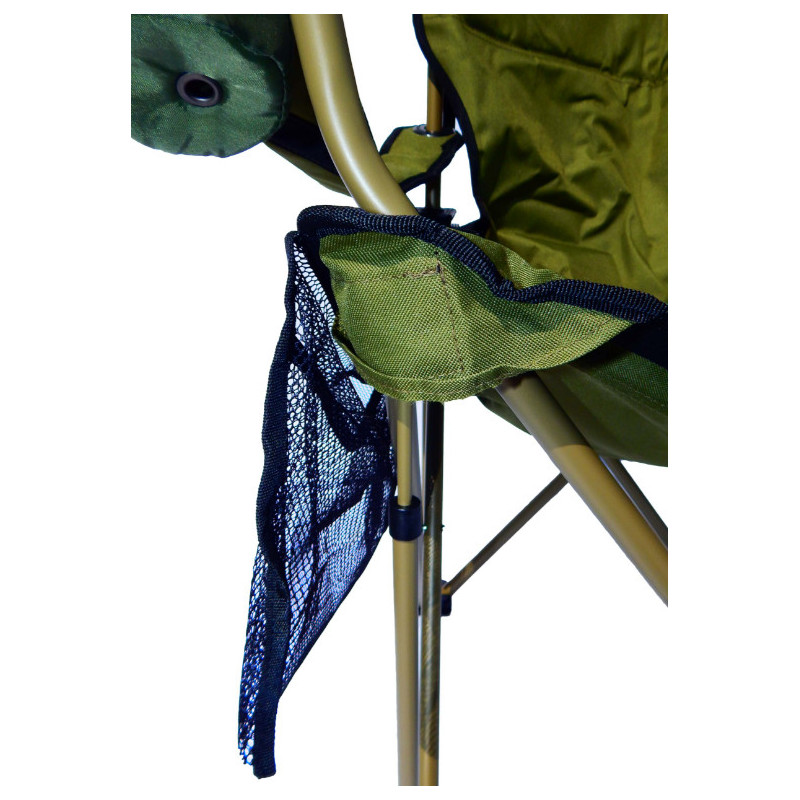 Передние части кресла усилены дополнительными трубами, для большей прочности, что позволяет увеличивать максимальную нагрузку. Спинка и подлокотники оснащены ремнями натяжения. Комплектуется чехлом, в который очень компактно складывается кресло.