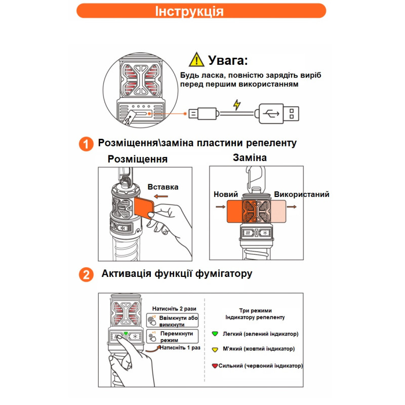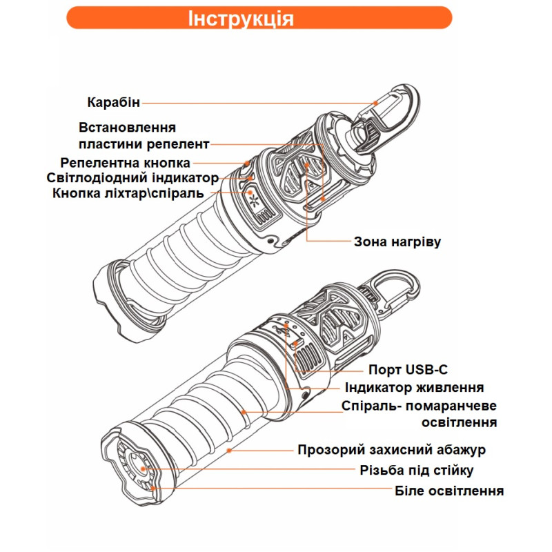 Режими роботи: спіраль, ліхтар, репелент, power bank. Є можливість користуватися 3 режимами одночасно.