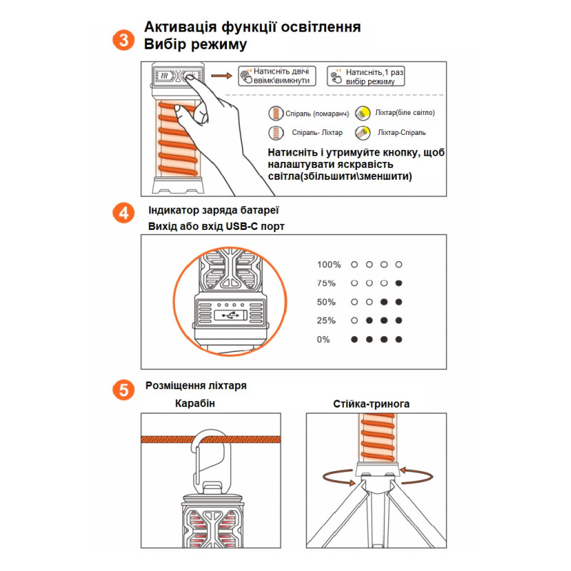 Комплектація: ліхтар, підставка- тринога, кришка захист від дощу, кабель USB-С, інструкція.